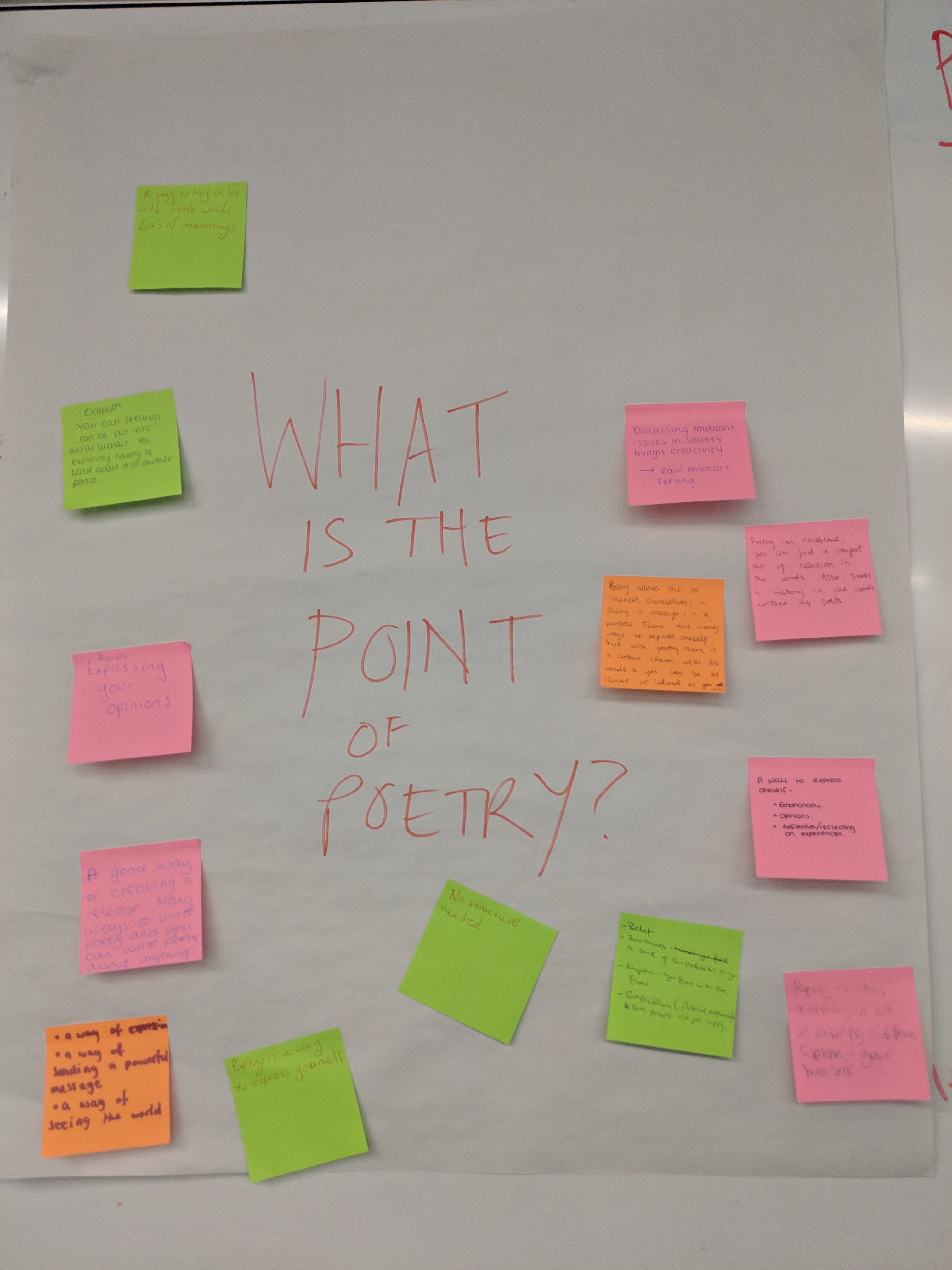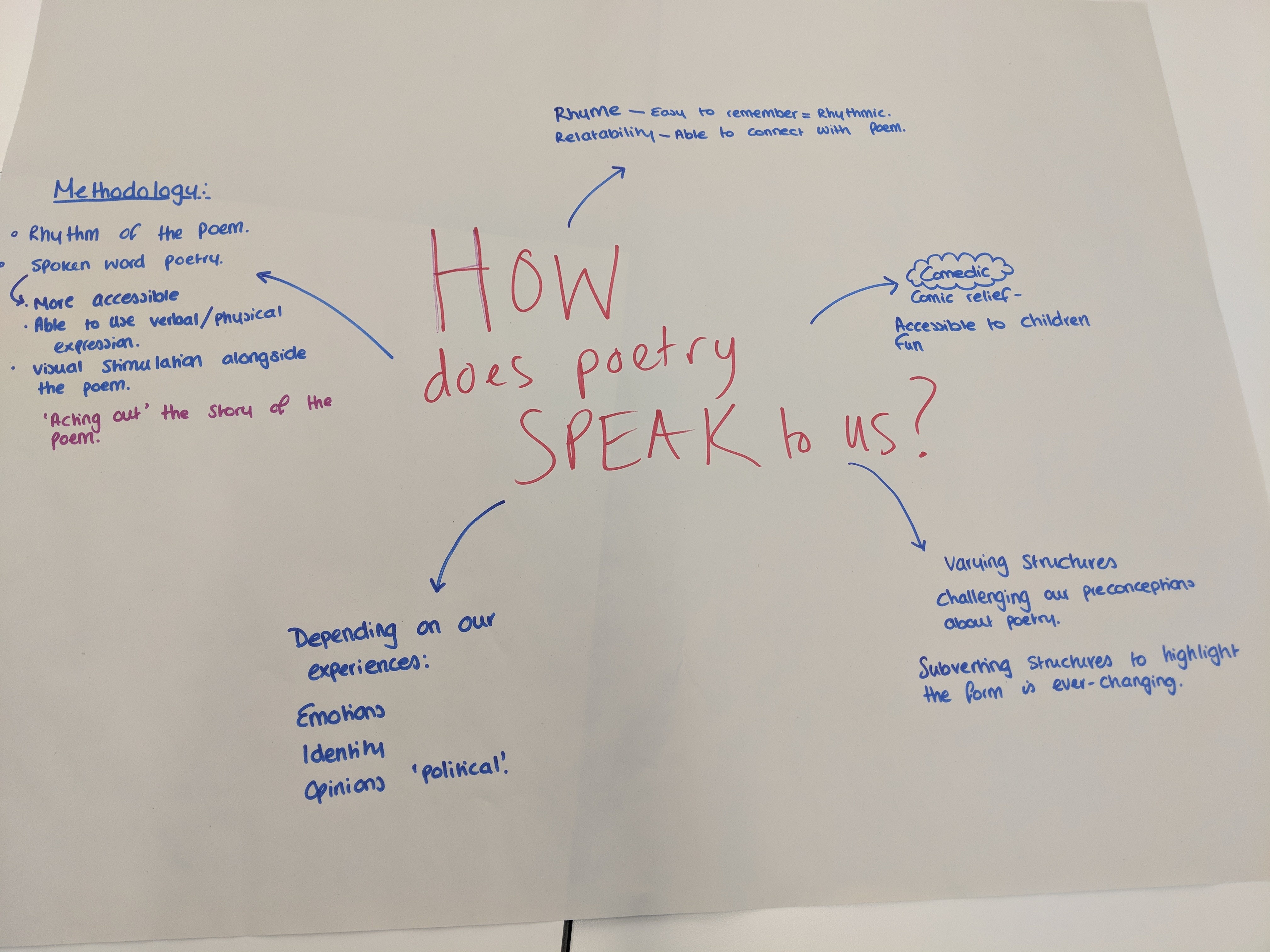 This was my favourite question that we discussed in the Edlab session because if I had a penny for every time, someone has told me they do not like poetry, ‘its boring or pointless’, I would be a millionaire. Still, it is understandable that some just do not like poetry as everyone has different interests. Even though I have loved poetry from a younger age, it still fascinates me how there is an importance and beauty within poems. Most of the answers to the question above were mainly focused on how poetry is gateway, a sanctuary for some. It is an expression of feelings that you might not be able to discuss through discourse, yet you are able to discuss it through the poem you write. This is the main reason why I love poetry, I believe it helps people and unfortunately not many people are aware of this. Students that are new to poetry generally respond to it by expressing confusion or dismissing it as some poems are quite complex. This is the downfall of how poetry has been taught in the past, in primary, secondary and college poetry had always been introduced in its poetic form and complex words. From a younger age, poetry should also focus on the raw expression and emotion which poems include as many people think that poetry has to rhyme and have complex words due to the poems that are used in English lessons. I am not saying never o use Shakespeare again as he is the ultimate legend of English language! Though, introducing poems that are not poetic, infamous or ones you can find on the poetry archive website would give students more knowledge on what poetry really is and that the rhyming does not matter! In addition, if poetry was used more in primary school it could be a technique for safe guarding as writing poems can also reveal real emotions that one goes through, I believe this would be an idea for an effective change in practising poetry in a classroom.