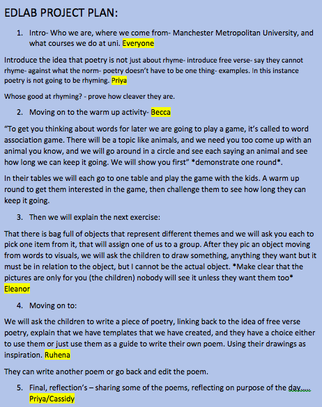 At my university, I joined an Edlab project that involves writing and exploring poetry written by children in Manchester, this builds on the status of Manchester as a UNESCO City of Literature. Our aim is to design work with the young people around the writing, performance and display of poetry. My group were assigned to hold a poetry workshop at Stanley Grove Primary School for year 5 children but before we conducted this task we had a few sessions with class peers and discussed topics regarding poetry and worked on a few questions.