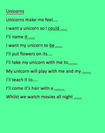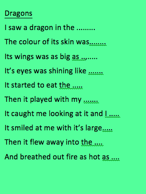 All the poems are very different from one another, we wanted to create a variety of templates so they can interest all of the children. The two poems below I created, I decided to make two poems, I had the theme mythical creatures so I chose a unicorn and a dragon as they are fascinating creatures and who does not love unicorn and dragons! Therefore the children would be fine connecting with the similes and metaphors I used in the poems as I wanted to make it catchy.
